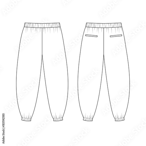 sketch of wide-leg pants with elastic waistbands, front and back views. Mockup of a template for fashionable Aladdin pants. Template for loose-fitting jogging pants.