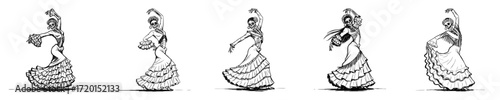 Sketch of women skeletons dancing flamenco, pencil drawing on the theme of the Day of the Dead, isolated vector image on a transparent background, seamless border, set of images
