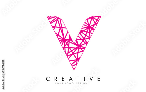 Sketched stylized Letter V with Pink Lines Pattern Design.