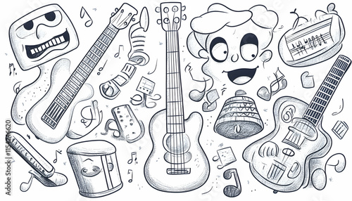 Sketchy Music Instruments & Cartoon Character Background Illustration.