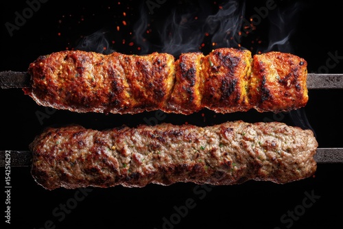 Skewered grilled kebabs of minced lamb and beef kofta on a black backdrop Top perspective