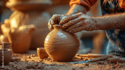 Skilled Artisan Shaping Clay Pottery on a Wheel with Focused Hands in a Warm and Inviting Workshop Environment, Showcasing the Art of Traditional Ceramics