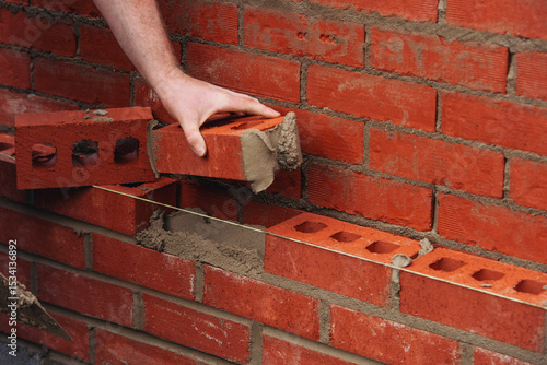 skilled bricklayer working on construction site laying red bricks for wall construction