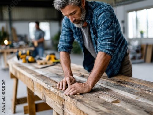 Skilled carpenter working diligently on wood in a workshop with tools and another worker in the background during daytime