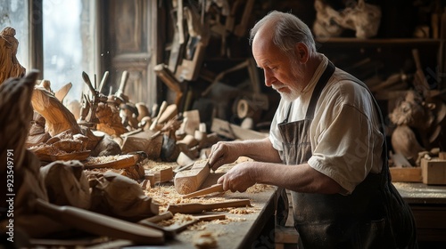 Skilled Craftsman Carving Wood in Rustic Workshop with Dedication and Precision.