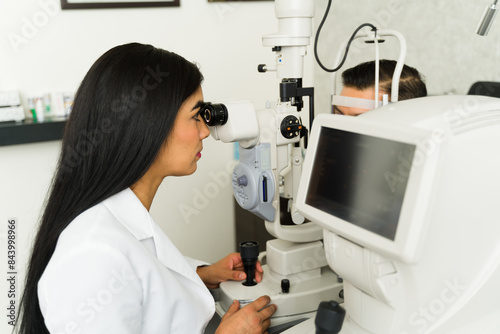 Skilled eye doctor utilizing state-of-the-art technology to assess a patient's vision in a contemporary medical facility
