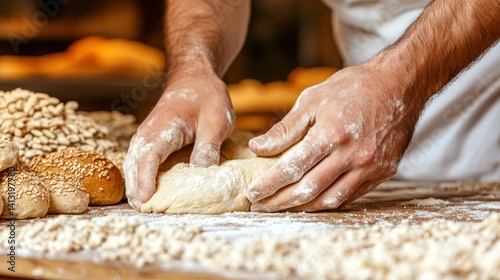 Skilled hands kneading dough on a wooden table