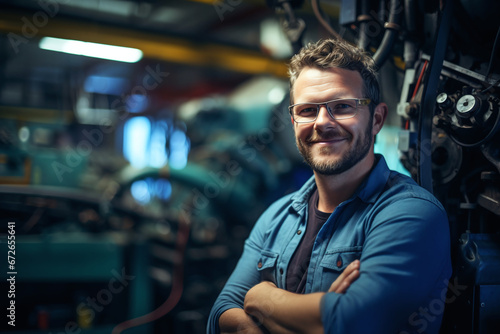 Skilled Mechanical Engineer Smiling Confidently in Industrial Workshop Environment