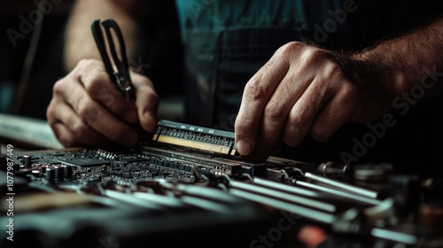 Skilled Technician Performing Precision Work on Circuit Board with Measuring Tool in Workshop Surrounded by Various Mechanical Equipment and Components