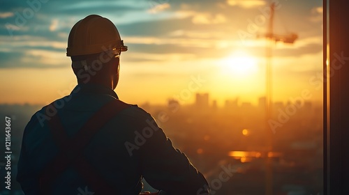 Skilled Worker Installing Glass Window During Urban Construction at Sunset