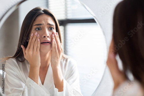 Skin Problems Concept. Unhappy Young Woman Looking At Mirror And Touching Face