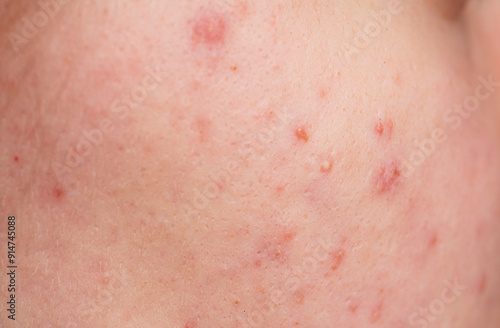 Skin texture background. Closeup acne pimple. Treatment for skin. Problem skincare. Pimples, acne, pores, scars. Natural skin. Skin care concept. Acne treatment. Pimples on face. Acne and pimple on