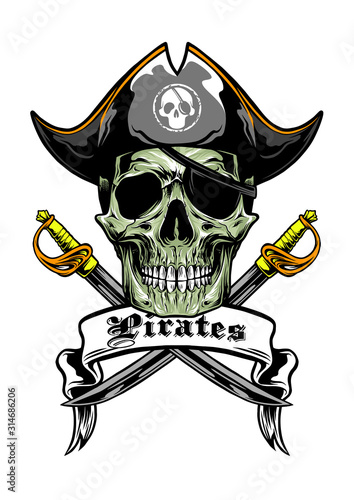skull pirates wearing hat and cross swords symbol logo. vector object illustration
