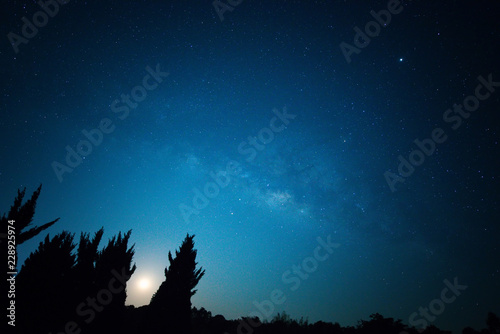 Sky at night with many star over pine forest, Beautiful clear sky at night, Bright star light with dark sky blue tone
