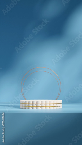 sky blue color wall and floor, 3d image render scene template white and gold podium in portrait