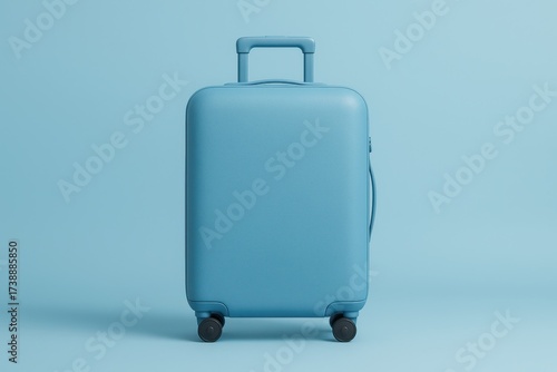 Sky blue hard shell suitcase standing upright on matching blue minimal backdrop