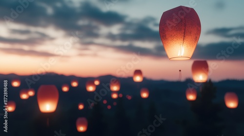 Sky lanterns floating at dusk enchanting evening sky scene