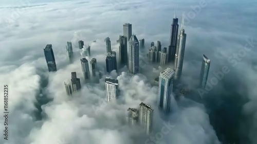 Skyscrapers Emerging Through Dense Cloud Layer Representing Urban Growth and Environmental Impact Concept