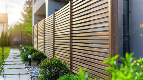 Slatted wooden fence panels with sleek, modern design in a minimalist garden. A perspective shot captures the fence’s length, guiding the eye along the garden pathway...