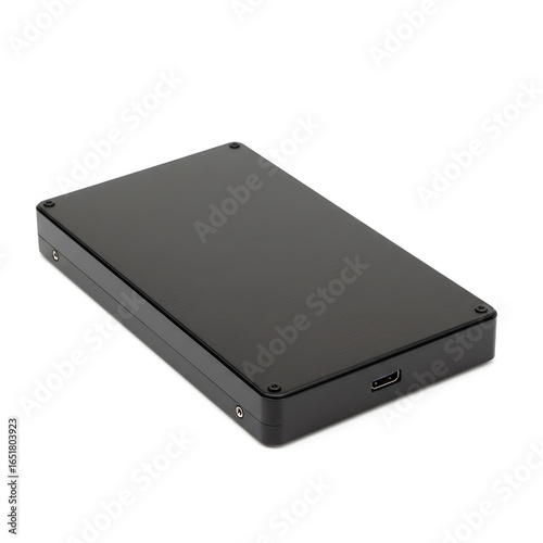 Sleek Black External Hard Drive Enclosure with USB Port on White Background