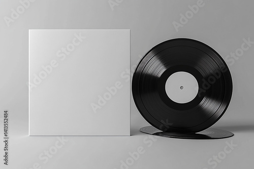 Sleek black vinyl record rests beside its blank white sleeve, ready for its musical debut. A minimalist design with stark contrast.