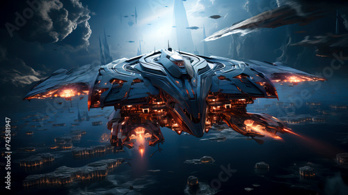Sleek Blue Spacefighter Soaring Over Alien Terrain created with Generative AI technology