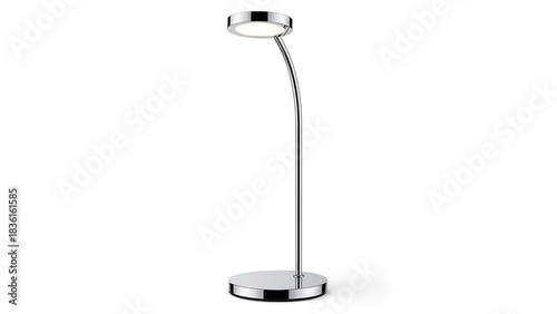 Sleek chrome desk lamp with round base and top emitting bright, even light