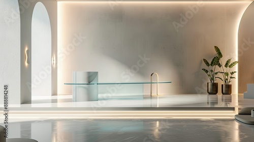 Sleek glass podium in a 3D-rendered space, illuminated by soft lighting, creating a modern and elegant display.