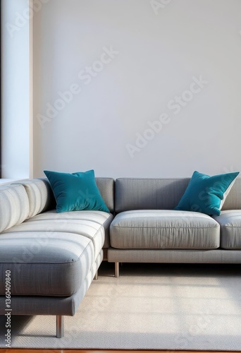 Sleek gray sectional sofa with plush teal pillows, minimalist setting, style, living, house