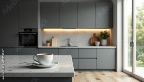 Sleek grey kitchen, elegant coffee cup on island , smooth, style