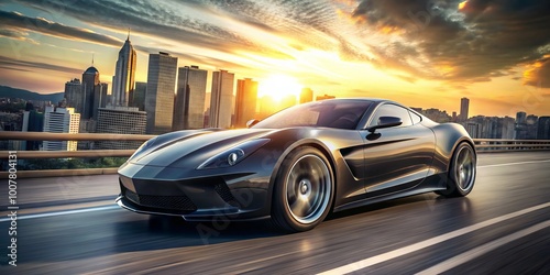 Sleek, high-performance vehicle with curved lines and aggressive stance, set against a blurred cityscape, evoking