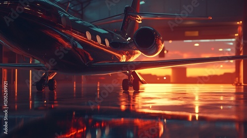 Sleek Jet in Hangar at Dusk Illuminated by Warm Sunset Light