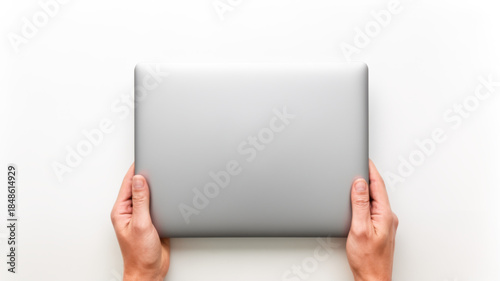 Sleek laptop silver computer minimalist design white background human hands modern device portable technology top view clean aesthetic workspace vibe gently inspire focus and calm
