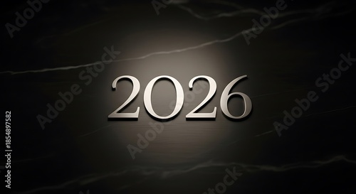 Sleek metallic numerals '2026' emerge from dark, textured background with subtle lighting