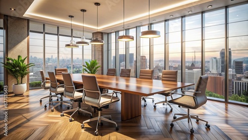 Sleek, minimalist conference room with floor-to-ceiling windows, polished wood table, and modern ergonomic chairs in a brightly lit atmosphere.