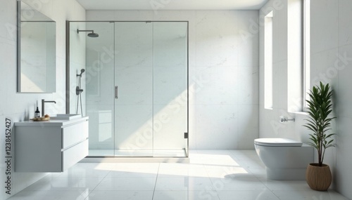 Sleek minimalist shower, frameless glass, white tiles, marble, monochrome, grey