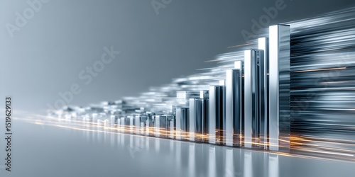 Sleek modern 3D bar graph: rising metallic blue, silver bars symbolize financial growth. Clean reflective white background. Light trails accent upward trend. Corporate.