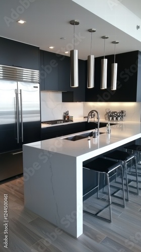 Sleek modern kitchen with quartz island and warm metallic lighting