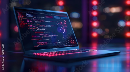Sleek Modern Laptop with Code on Screen in a Dimly Lit Room with Red and Blue Lights