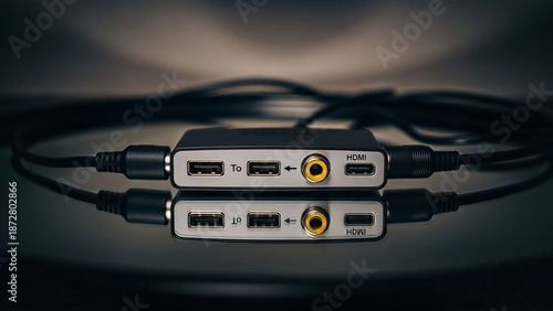 Sleek modern multiport adapter hub with reflection on a dark surface.