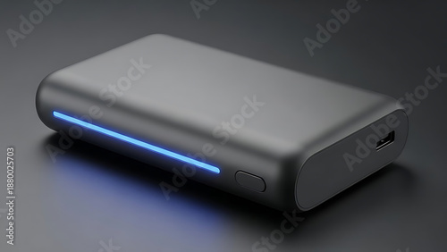 Sleek portable charger with vibrant blue LED indicator, illustrating modern technology and power.