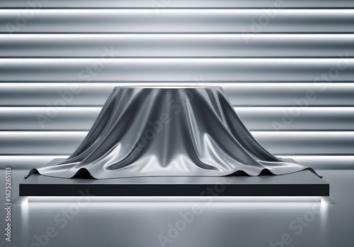 Sleek silver cloth draped over modern pedestal; minimalist, dramatic product reveal backdrop.