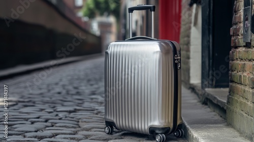 Sleek Silver Luggage on Cobblestone Pathway with Red Door