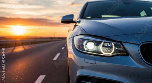 Sleek Silver Luxury Car on Open Road at Sunset with Glowing Headlights