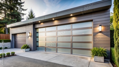 Sleek, silver modern garage door with frosted glass panels and horizontal lines adds a touch of sophistication to a contemporary suburban home's exterior.