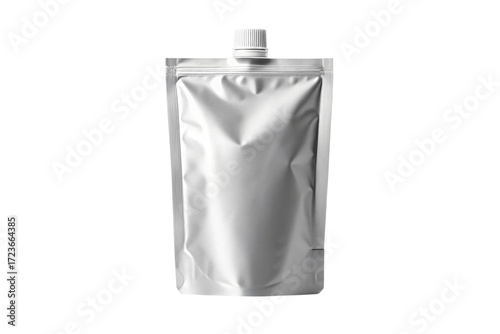 Sleek silver stand-up pouch with white cap, perfect for modern product packaging and branding needs