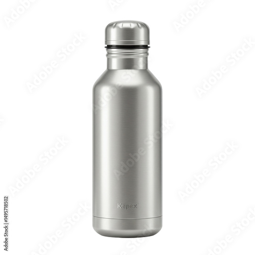 Sleek silver water bottle stands tall against a stark black backdrop. Modern and minimalist