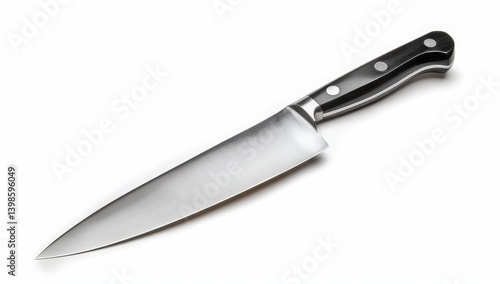 Sleek stainless steel chef's knife on a white background.