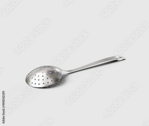 Sleek stainless steel perforated skimmer spoon on a clean white background. 3d illustration
