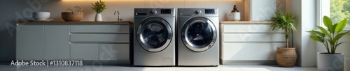 Sleek steel washer & dryer in modern laundry room, chrome, design